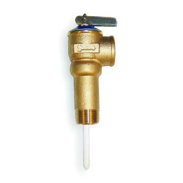 Temperature and Pressure Relief Valve, Inlet Type MNPT, Outlet Type FNPT, Inlet Size 3/4 in, Outlet Size 3/4 in, Thermostat Length 3 in, Body Height 7 1/2 in, 105,000 BtuH BtuH, Factory Set Pressure 150 psi, Max. Temp. 210 Degrees F, Shank Length Extended, Auto Re-Seating Yes, Body Material Bronze, Spring Material Stainless Steel, Body Width 1 1/8 in, Standards ANSI Z21.22, ASME Code HV, CSA, CSA 4.4