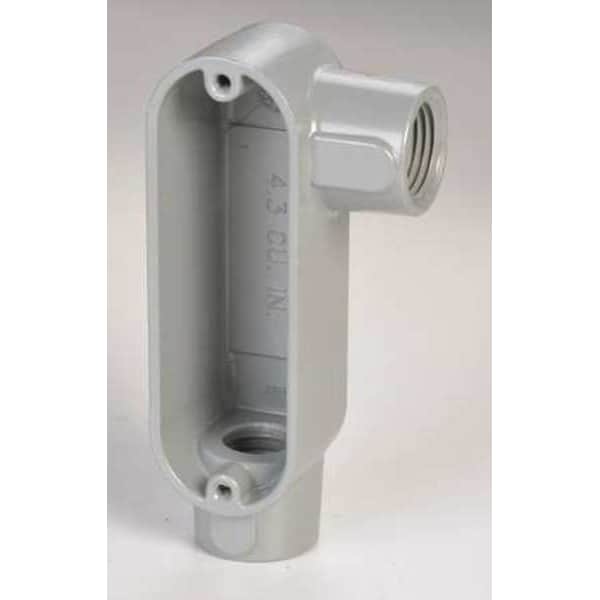 Conduit Outlet Body, Overall Width 4 7/8 in, Overall Length 16 1/2 in, Trade Size 4 in, Compatible Conduit Trade Size 4 in, Hub Size 4 in, Aluminum, Compatible Conduit Type IMC, RMC, Back Type Round, Body Capacity 330 cu in, Body Style LL, Body Type Conduit Outlet Body, Color Gray, Connection Orientation 90 Degrees , Connection Type Threaded, Finish Powder Coated, For Use With IMC, RMC, Hazardous Location No, Hub Style Threaded, Number of Hubs 2, Shape L