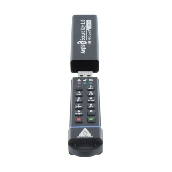 The Apricorn brand 1TB 256-Bit AES XTS Hardware Flash Drive has a maximum write speed of 162 MB/s and a maximum read speed of 195 MB/s. It has a height of 0.5", a width of 1", and a length of 3.8".