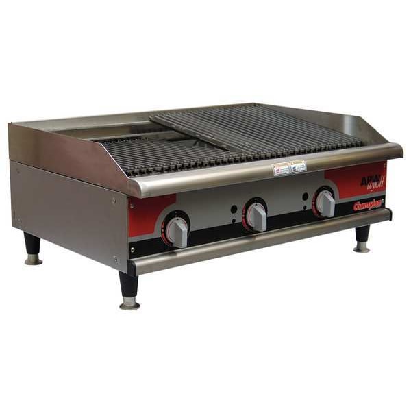 Countertop Gas Charbroiler, Power Source Gas, Cooking Surface Depth 18 in, Cooking Surface Width 35 3/4 in, Overall Height 15 1/2 in, Overall Width 36 in, Overall Depth 26 7/8 in, Material Aluminized Steel, Stainless Steel, Number of Burners 3, Installation Type Countertop, Includes Adjustable Legs, Grease Collection Pan, Removable Top Grates, Sides and Back Panel