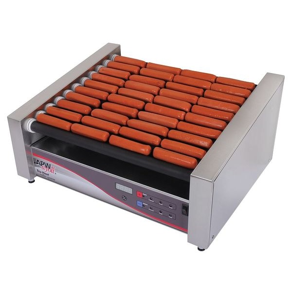 Flat Hot Dog Roller Grill, Product Type Flat Roller Grill, Capacity Up to 50 Hot Dogs, Cooking Surface Depth 18 5/8 in, Cooking Surface Width 30 1/2 in, Overall Height 8 1/2 in, Overall Width 34 3/4 in, Overall Depth 5/8 in, Voltage 120V AC, Current 11.7 A, Wattage 1,320 W, Power Source Electric, Cooking Surface Material Chrome, Cord Length 60 in, Features (11) Textured Non-Stick Chrome Rollers, Frame Material Stainless Steel, Includes Removable Aluminum Drip Pan, Plug Type 5-15P