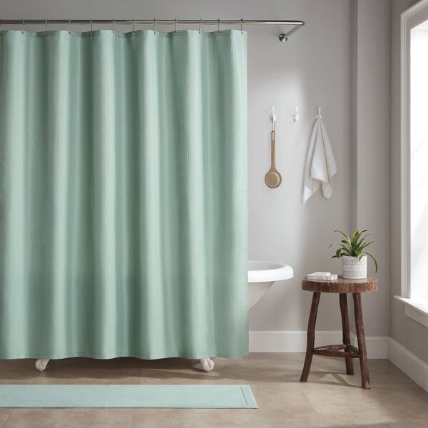 This stunning premium quality shower curtain set has a lovely solid color jacquard and is designed with an intricate woven stripe and grid pattern with a subtle raindrop stitch overlay, creating instant appeal. This premium quality shower curtain set comes complete with a weighted hem, rust-resistant rolling rings, and metal grommets. The 100% polyester fabric feels soft and sleek, repelling water, stains, and oil. Choose from four spa colors inspired by today’s classic trends that will elevate your bath decor to a new level of elegance. Elevate your bathroom decor with this distinctive shower curtain featuring an intricate raindrop stitch design gracefully layered over two woven stripe patterns. This elegant combination of textures is visually captivating, making this curtain a stylish and eye-catching addition to your bath space. Whether you're upgrading your home, vacation homes, rental properties, collegiate dorms, or even AirBNBs, our raindrop jacquard shower curtain set is a seamless fit. The understated elegance of the raindrop stripe pattern ensures that it won't compete with large prints or textures, seamlessly blending into any decor style. Its timeless design and versatility make it an excellent addition to any bathroom. Hang this curtain set wherever you desire, and you'll surely be pleased with the lovely results it brings to your space. Transform your bathroom instantly with our raindrop stripe shower curtain set. You'll love the durability of our 210 GSM polyester jacquard fabric. Its tight weave, sturdy hem, and metal grommets with heavy-duty rolling rings prevent tearing and stretching. Our proprietary "Three Proof" treatment repels water, stains, and oils, keeping it fresh longer. Enjoy a soft, sleek feel when you touch this shower curtain, thanks to the fine polyester threads. Invest in quality, longevity, and style with our shower curtain set.