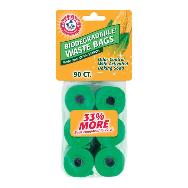 Arm & Hammer replacement corn starch waste bags are made from cornstarch and can be used in multiple ways. These quick-load pet waste bags control odor naturally with the freshening power of baking soda. Other uses include baby diapers, wet bathing suits. Tear the bag at the perforation and place hand in the bag. Pick up waste and turn the bag inside out.