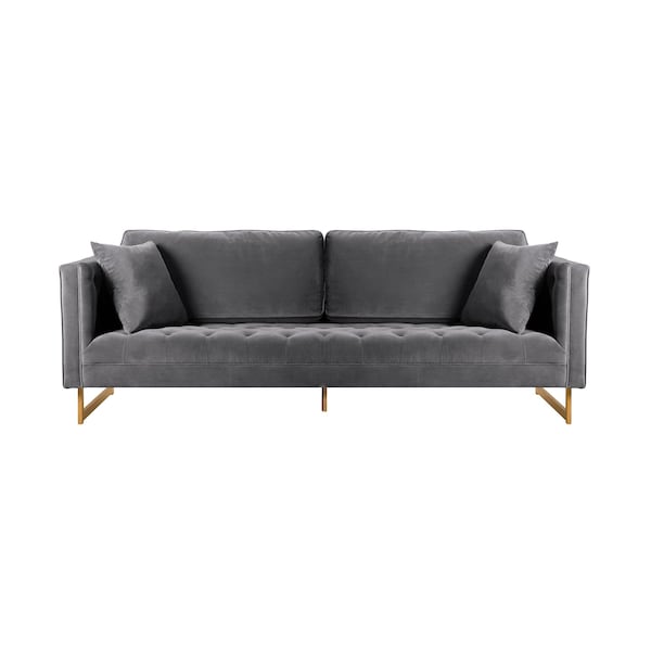 Make a chic statement in your living room with The Armen Living Lenox Velvet Modern Sofa with Brass Legs. Featuring a glam and modern silhouette, the Lenox is upholstered in a rich velvet fabric that feels exceptionally soft to the touch. Channel tufting highlights the stunning sheen in the velvet, while the striking antique brass finished metal base anchors the glamorous look of this sofa. Accompanied with pillows and diamond stitch cushion seats, the Lenox Sofa will be the most comfortable seat in the house. The Armen Living Lenox Sofa is available in your choice of Gray, Pink or Blue. Included: 1 Sofa Seat Height: 18 Inches Upholstery Material: 100% Polyester Upholstery Color: Gray Feature: Diamond stitch cushion seats with pillows provide luxurious comfort level Feature: Rich velvet fabric that feels exceptionally soft to the touch Feature: Reversible cushions Feature: Antique Brass metal base provide sturdiness and durability Assembly Required: No Ships In: 1 Box Seat Height: 16.7 in. Arm Height: 5.7 in. Product Dimensions: 90 W x 39.8 D x 34.5 H NOTE: Color and saturation may vary due to lighting and monitor/phone screen settings