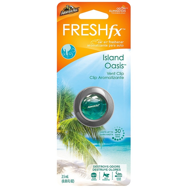 Air Freshener, Air Freshener Style Vent Clip, Container Type Box, Container Size 2.5 mL, Fragrance Island Oasis, Color Black, Orange, VOC Content Weight Percentage Not Applicable, Product Form Liquid, Air Freshener Duration 30 day, Features Fogger Spray Eliminates Active Odors from a Car's Seats, Rugs and Interior, Works Against Dog Smell, Smoke Odor and Food Odors