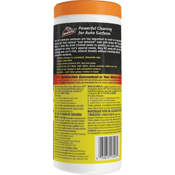Your cars delicate surfaces are too important to trust to a household cleaner. Get that natural just detailed look from Armor All Cleaning Wipes. Meticulously engineered for your cars special needs these convenient wipes lift away dirt and debris revealing your cars rich natural beauty without harming delicate surfaces. Great for your cars dash vinyl fabric carpet consoles leather and more. Lint-free disposable Cleaning Wipes wont leave a greasy residue on your hands. Features a Moisture Lock Lid which assures wipes will not dry out for one year after purchase.