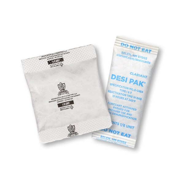Desiccant, Desiccant Bag Type Container, Area Protected 0.14 cu ft, Width 1 in, Length 2 1/2 in, Desiccant Bag Size 1/6 oz, Container Type Pail, Bags per Package 1,200, Humidity Levels 8 Percent, Indicators per Case 1, Application Closed Containers, Material Tyvek, Color White, Package Quantity 1200