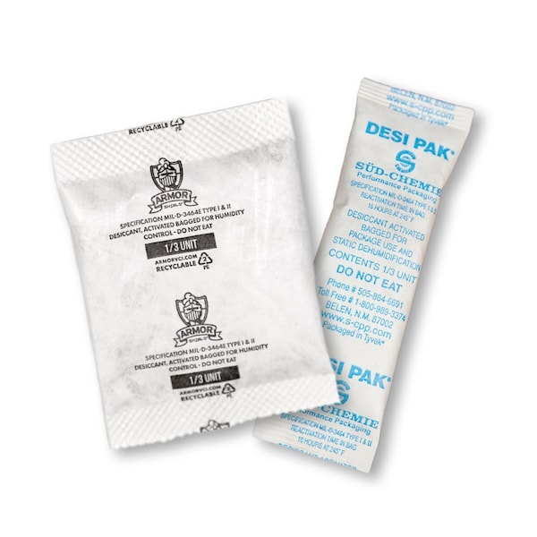 Desiccant, Desiccant Bag Type Container, Area Protected 0.28 cu ft, Width 1 in, Length 3 1/2 in, Desiccant Bag Size 1/3 oz, Container Type Pail, Bags per Package 700, Humidity Levels 8 Percent, Indicators per Case 1, Application Closed Containers, Material Tyvek, Color White, Package Quantity 700