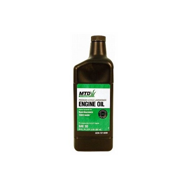 MTD 20 oz. 4-Cycle SAE30 Premium Grade Lawnmower Oil. It meets or exceeds API classification SJ. It is packaged in a bottle.