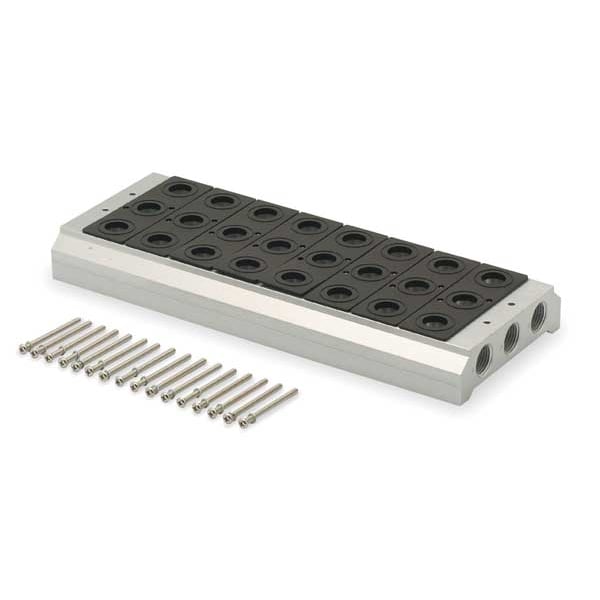 Manifold Kit, For Use With Maxair 1/2 in Solenoid & Pilot Series, Number of Valve Stations 8, Valve Port Size 1/2 in, Solenoid Valve Manifold, M34M04 Series, Length (In.) 12 3/8 in, Width (In.) 4 7/8 in, Height (In.) 1 3/8 in, Includes Manifold, Seals, Valve Attaching Hardware