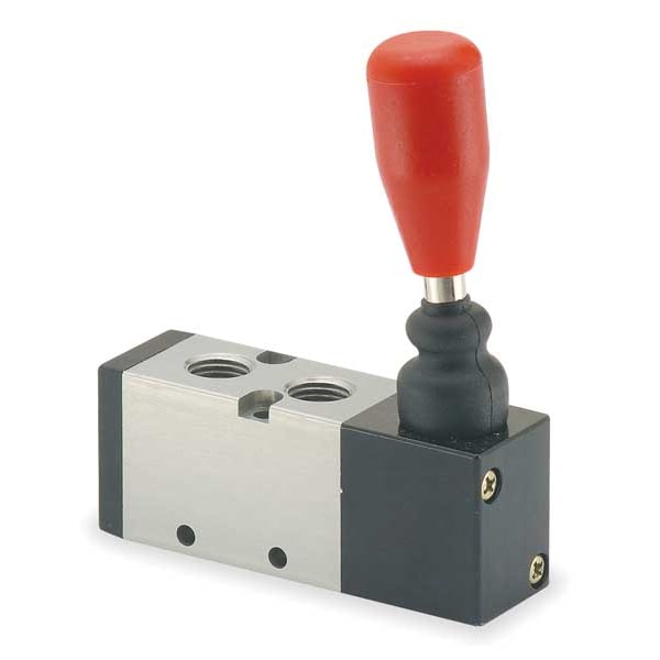Manual Air Control Valve, Valve Ways and Positions 4-Way/2-Position, Valve Port Size 1/4 in, Connection NPT, Valve Actuator / Return Lever / Manual, Max. CFM - Valves 26 cfm, Valve Max. Pressure Rating 140 psi, Valve Temp. Range 15 Degrees to 122 Degrees F, Center Position Not Applicable, Coefficient of Volume 0.7, Body Material Aluminum, Overall Length 3 7/16 in, Overall Height 4 5/16 in, Overall Width 1 in, Series MaxAir, Manual Air Control Valve