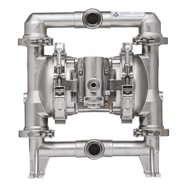 Diaphragm Pump, Air Consumption (Maximum) 50 scfm, Air Intake Connection Size 1/4 in, Air Intake Connection Type NPT, Check Seat Material 316 Stainless Steel, Diaphragm Material PTFE, Feet of Head (Maximum) 16.5 ft, Flow Rate (Maximum) 54 gpm, Manifold Connection Single Port, Media Discharge Connection Size 1 1/2 in, Media Discharge Connection Type Tri-Clamp, Media Discharge Location Top, Media Intake Connection Size 1 1/2 in, Media Intake Connection Type Tri-Clamp, Media Intake Location Bottom