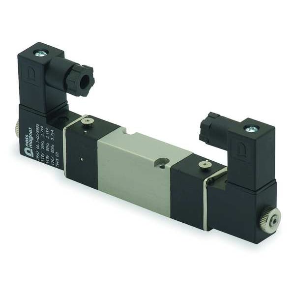 Solenoid Air Control Valve, Valve Ways and Positions 4-Way/2-Position, Voltage 120V AC, Center Position Not Applicable, Valve Actuator / Return Solenoid / Solenoid, Pipe Size 18 mm, Max. CFM - Valves 30 cfm, Operational Pressure Range 0 to 115 psi, NEMA Classification NEMA 4, Body Style Base-Mounted, Coefficient of Volume 0.3, DIN Connectors Electrical Connections, Shifting Technology Solenoid/Pilot, Power Consumption 2 W, Ambient Temp. Range 0 Degrees to 122 Degrees F, Override Non-Locking