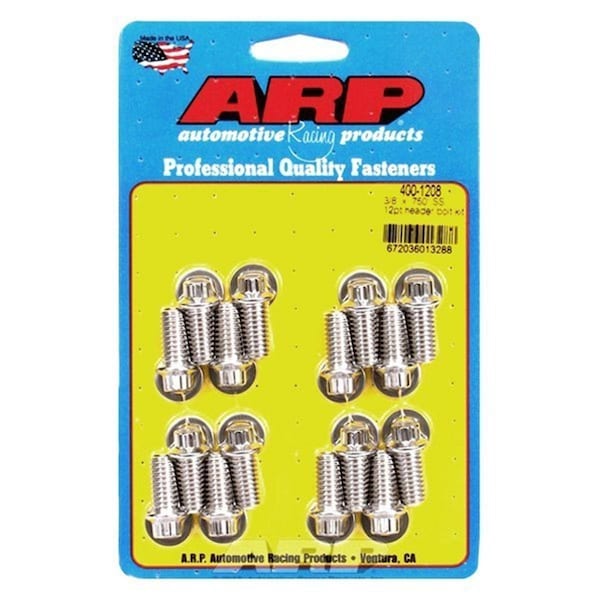 0.37 x 0.75 in. Stainless Steel Header Bolt Kit - Pack of 16 Features Provide a substantial extra margin of safety over Grade 8 and other hardware For use on cars, boats, and trailers Stock up on these truly maintenance-free bolts A proprietary alloy that is impervious to rust and corrosion Pack of 16 Specifications Material: Stainless Steel Thread Size: 0.37 in. Underhead Bolt Length: 0.75 in.