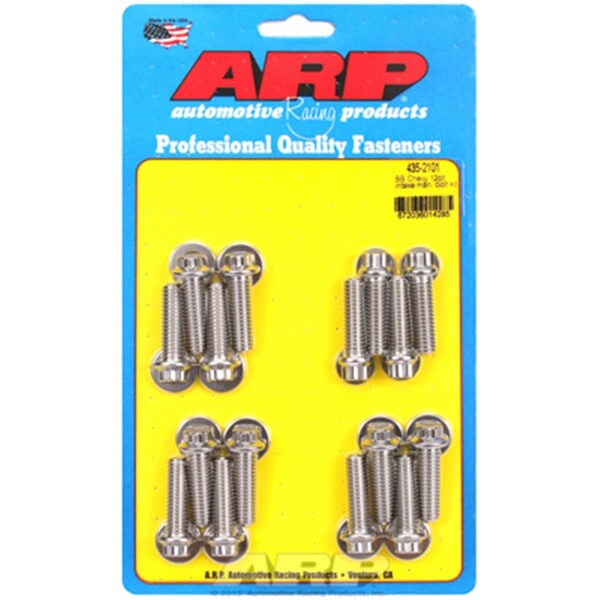 ARP stainless steel intake manifold bolts are 15 percent stronger than Grade 8 steel bolts and have a wide-area flange for better load distribution. They also have precision-rolled threads which prevent galling and promote more consistent torque loading. These bolts are both corrosion and heat-resistant and come highly polished. Washers are included. Features Fastener Style - Bolt Head Style - 12-point Fastener Material - Stainless steel Fastener Finish - Natural Washers Included - Yes Year - 1979-1990 Engine Size 6.5L 396 7.0L 427 6.6L 402 7.4L 454