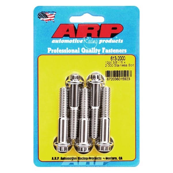 0.37-16 x 2 in. Stainless Steel 12 Point Bolt Kit - Set of 5 FeaturesProvide a substantial extra margin of safety over Grade 8 and other hardware For use on cars, boats, and trailers Stock up on these truly maintenance-free bolts A proprietary alloy that is impervious to rust and corrosion Set of 5 SpecificationsMaterial: Stainless Steel Fastener Head Style: 12 Point Thread Size: 0.37-16 in. Underhead Length: 2 in.