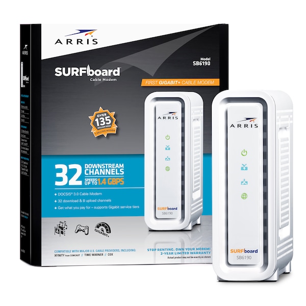 Introducing the first Gigabit+ Cable Modem on the market. The SURFboard SB6190 is a DOCSIS 3.0 modem is capable of download speeds up to 1.4 Gbps! That’s fast enough to download multiple HD movies in one minute! Power your home network with the SB6190 to deliver the fastest speeds and most reliable connection to the Internet. With over 175 million sold, it’s easy to see why we’re the market leader! Requires CABLE Internet Service, if not sure your provider is CABLE call them to confirm. Perfect for Comcast Xfinity Internet Blast and Extreme! Approved for Cox Cable Ultimate. PENDING approval for Time Warner Cable, Charter and BrightHouse Networks. Internet speeds up to 1.4 Gbps DOWNLOAD and 262 Mbps UPLOAD based on your Cable ISP subscription. 32 DOWNLOAD & 8 UPLOAD channels to future proof your modem as your Cable ISP enhances service offerings. Gigabit Ethernet port to connect to computer or Router for fast downloads. Wired modem only, does NOT include WIFI Router or VOIP Telephone adapter. Ideal for streaming HD Video and gaming on multiple devices at a time.