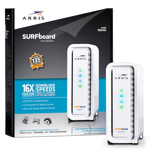 Building upon the success of the SB6121 and SB6141, ARRIS SURFboard SB6183 enhances your personal media experience, at lightning-fast broadband speed. It harnesses the power of DOCSIS 3.0 technology to bond up to sixteen downstream channels and four upstream channels--providing you advanced multimedia services with data rates up to 686 Mbps download and 131 Mbps upload depending on your Cable Internet provider service. That makes streaming HD Video, gaming, shopping, downloading, working, high-quality voice and video conferencing, and peer-to-peer networking applications far more realistic, faster, and efficient than ever before. And, with over 175 million sold, it’s no wonder ARRIS is the market leader in modems. Perfect for the NEW TWC MAXX plans in NY, LA, Austin, San Antonio, Dallas, Raleigh/Durham and Kansas City! TWC customers in Charlotte and Hawaii will begin seeing TWC MAXX upgrades in 2015 as well. Also perfect for Comcast Xfinity Internet Blaze and Extreme, Brighthouse ULTRAfi and Charter Spectrum Internet. 16 download & 4 upload channels to future proof your modem as your Cable Internet Provider enhances capability. Internet download speeds up to 686 Mbps and upload speeds up to 131 Mbps based on your Cable provider service. Ideal for streaming HD Video and gaming on multiple devices at a time. Supports IPv4 and IPv6 - the latest Internet standard. REQUIRES CABLE INTERNET SERVICE, IF NOT SURE YOUR PROVIDER IS CABLE, CALL THEM TO CONFIRM