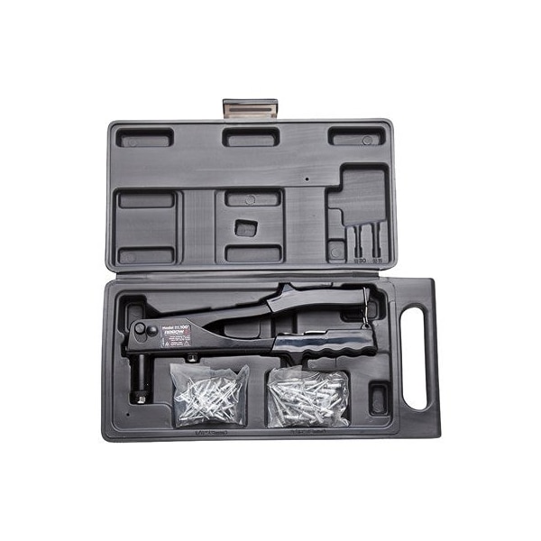All Steel Construction Rivet Tool Kit, Strong, NonSlip Vinyl Grip, Plus 25 Medium 18 3 mm Aluminum Rivets, 25 Medium 316 5 mm Aluminum Rivets, Custom Molded Case, Spring Loaded Handle For Easy Loading, Includes Interchangeable Nose Piece, Not Recommended For 316 All Steel Rivets