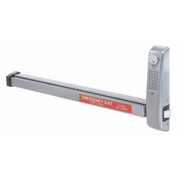 Panic Alarm Device, Finish Satin Aluminum, Cylinder Type Mortise, Arm Type No Arm, Alarm Type Horn, Inside Keyed Cylinder Type Mortise, Siren Style Horn, Activated By Unauthorized Egress, Alarm Duration 2 min, Coverage 6 ft, Door Handing Non-Handed, Body Thickness 2 in, Body Length 2 5/8 in, Body Height 12 3/4 in, Body Width 2 5/8 in, Decibels 90 dB, Power Source 9V Battery, 0.3 Amps, Housing Material Alloy, For Door Thickness 1-3/4 in, Standards ANSI 156.3