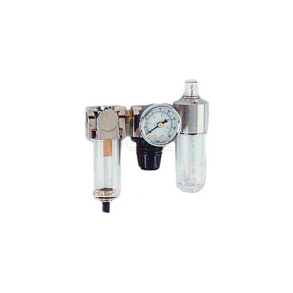 Arrow 1/8" mini f/r & lubricator 7621, gauge, poly bowl, manual features 1/8" npt 40 to 150f range 150 psi (max) poly construction 20 micron rating gauge included