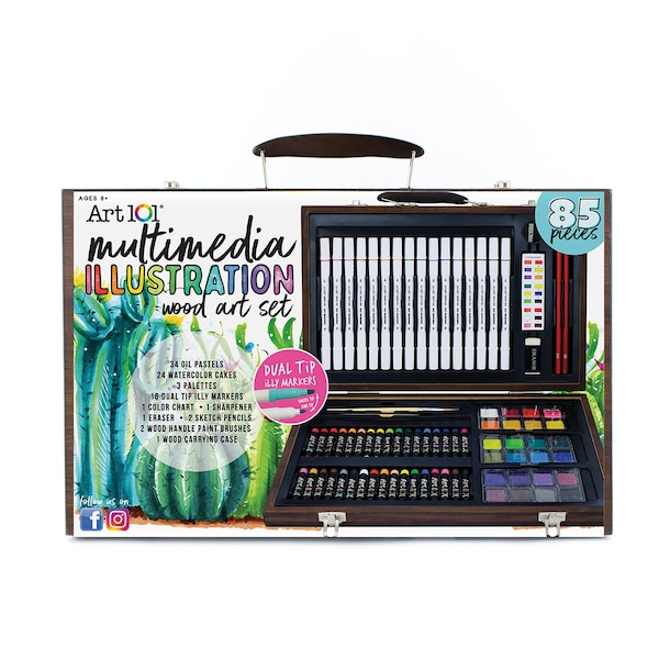 Art 101's Multimedia Illustration Wood Art Set comes with 85 pieces, including a number of different mediums that are perfect for creating your next illustration! This set features our professional quality, alcohol-based Illy Markers, which come with a dual chisel and bullet nibs. Use the chisel nib to shade in large areas and use the bullet side to add fine lines or detail! Your vibrant set of Illy Markers also includes a blending Illy, which allows you to seamlessly blend your colors as you draw. These markers are perfect for illustrations, fashion design, scrapbooking, architectural drawing, calligraphy, and more! You will also find in your set 34 of our creamy and pigmented oil pastels, making it easy for you to shade and blend the colors to create depth and dimension. Sketch out your composition before adding additional mediums with the included two sketch pencils, sharpener, and eraser. Want to try your hand at painting? Use the 24 watercolor cakes and included paint brushes to add soft and light colors. If you need some extra guidance when blending and creating new colors, refer to the handy color chart also included. Organize all of your artistic tools in a high-quality, convenient wooden carrying case, making them easy to use whenever inspiration strikes!