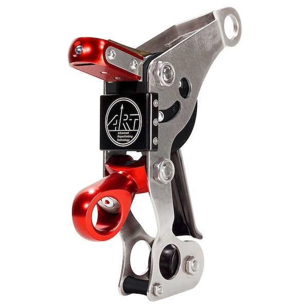 Multi-functional self-blocking rope control device for the running double rope. The running rope is directly in front of the climber so it is possible to pull and feed the rope very comfortable with one hand or hand over hand into the device. Turning it in the releasing position and pressing the thumb brake needs very little force so speed regulation is very easy. This smoother handling allows for more convenience and safer feeling when using the speed control. The has a secured locking position function. This gives a maximum of safety when working. The frame is made of high quality stainless steel, so the danger of failure is very low even under high stress. The integrated swivel allows to turn and use the device always in the optimum direction. There is a pulley under the body so the pull force from a deflected rope is smoothly absorbed in the device instead in the hand of the climber. It is not possible to place the cam erroneously in the wrong direction. The big replaceable wearing pin inside the rope channel allows for working with the device for many years. Certified according to EN 358, for left and right handers. Two cams for ropes with diameters 11-12 mm and 12-14. Minimum breaking strength: 4,945.6 lbs. (22 kN), working load limit: 440 lbs. Weighs 1.13 lbs.