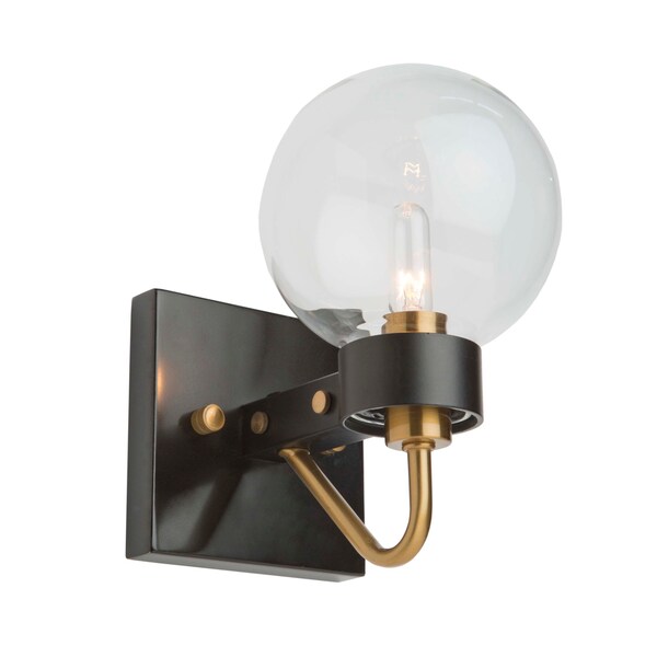 The Chelton collection features a matte black frame, harvest brass accent and canopy with clear circular glassware (glossy white glassware available). Single light wall sconce. (Many matching units available).