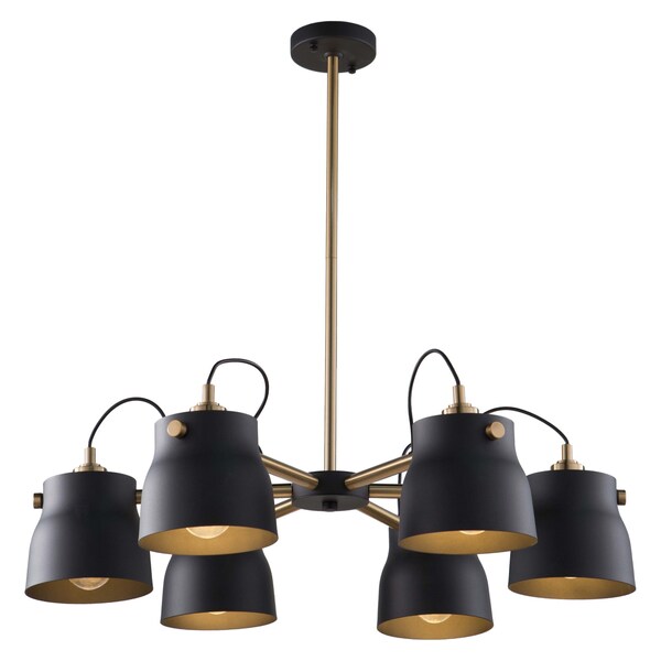 The Euro Industrial Collection Features Matte Black Metal Shades Complimented With Harvest Brass Nobs, Hardware And Rods. The Interior Of The Metal Shades Is Plated In A Reflective Brass. Wire Comes Out Of Socket For An Industrial Look. (Other Chandelier Sizes And Wall Sconce Available). 6 Lite Chandelier Shown.