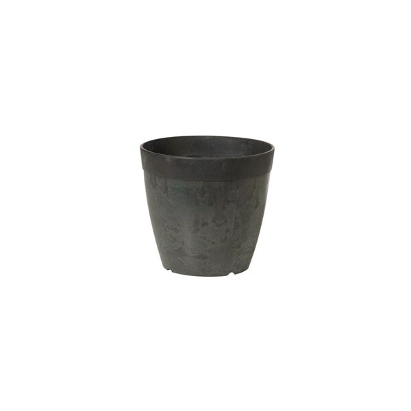 Novelty ArtStone Dolce 8in black round indoor/outdoor planter has built-in internal Water Minder Reservoir Drainage System which rehydrates indoor plants as needed. Made from proprietary blend of resin and natural stone. Includes footed bottom for airflow. No need for saucer/tray. Keep rubber plug inserted for indoor use. Remove rubber plug for outdoor use. Frost & UV resistant.