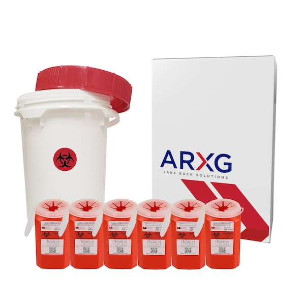 Sharps disposal is a public health and safety issue that is commonly overlooked. Protect your community by providing a simple, safe, and effective way to dispose of sharps, keeping waste management workers and our environment out of danger. Simply insert your sharps into a smaller container to fit within the larger 5 gallon receptacle, seal the container, and place it into the liner box with the prepaid mailing label. Ship your sharps to the destruction facility for no additional charge! Perfect for business, facility, community, and individual at-home use! The 1.5qt Sharps Container is leak-tight on the bottom and sides, OSHA compliant, safe for the vertical syringe drop method, puncture-resistant, transportable, pre-assembled. The 5 gallon receptacle is not to be used with loose needles; sharps must be contained in smaller, puncture-resisant containers. ARXG is committed to protecting our environment from the effects of improperly disposed of sharps. We take our commitment to the environment a step further by partnering with one of the largest Waste-to-Energy WtE facilities, minimizing any impact these items have on the environment.