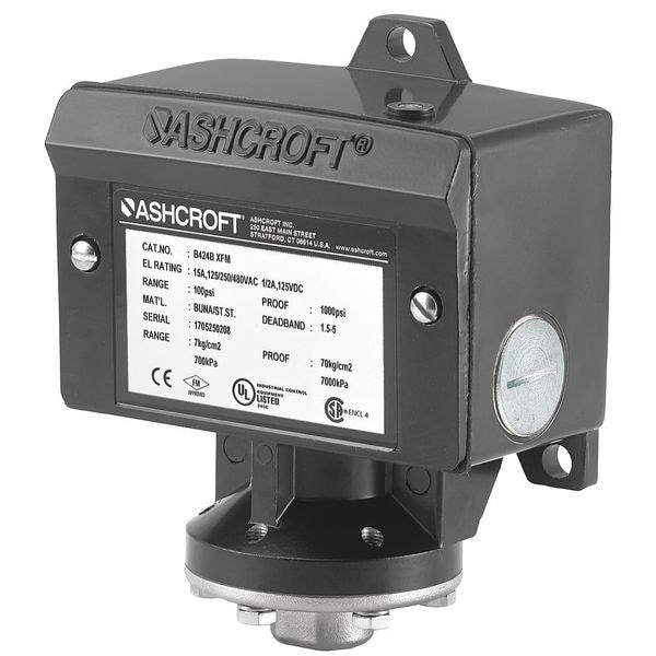 Pressure Switch, Differential 0.5 to 1.5 psi, Range 1.5 to 15 psi, Port Type 1-Port 1/4 in FNPT, Contact Form SPDT, NEMA Rating 13, 3, 4, 4X, Actuation Type Diaphragm, Action Standard, Series B, Factory On/Off Setting 90 Percent of Range, AC Contact Rating 15 A @ 125 V, 15 A @ 250 V, 15 A @ 480 V, DC Contact Rating 0.25 A @ 125 V, 0.5 A @ 120 V, 6 A @ 30 V