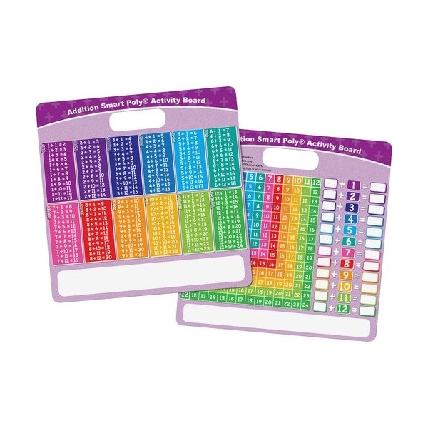 Addition Smart Poly Busy Board helps children learn their addition tables from 1 to 12. One side of the colorful, dry-erase board shows addends and their sums in rows grouped by the first number. The other side showcases a full addition table along with a worksheet column where students can write in an addend and then the resulting answer. Both sides include blank sections for practice and notes. Perfect for reusable learning anywhere, the write-on/wipe-off surface lets you write directly on the board and quickly wipes clean for your next session. Use with dry-erase or water-based markers and washable crayons. No lamination is needed. Heavy-duty cardboard coated with poly material is designed to be long-lasting, easy to clean and water-resistant for many years. Carry easily with the die-cut handle. Durable board includes a black, dry-erase marker fine point.