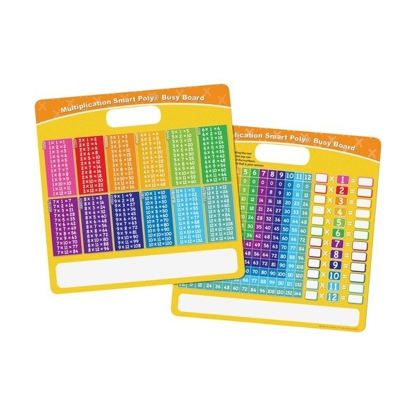 Multiplication Smart Poly Busy Board helps children learn their multiplication tables from 1 to 12. One side of the colorful, dry-erase board shows factors and their products in rows grouped by the first number. The other side showcases a full multiplication table along with a worksheet column where students can write in a factor and then the resulting answer. Both sides include an entire blank section for notes and math problems. Perfect for reusable learning anywhere, the write-on/wipe-off surface lets you write directly on the board and quickly wipes clean for your next session. Use with dry-erase or water-based markers and washable crayons. No lamination is needed. Heavy-duty cardboard coated with poly material is designed to be long-lasting, easy to clean and water-resistant for many years. Carry easily with the die-cut handle. Durable board includes a black, dry-erase marker fine point.
