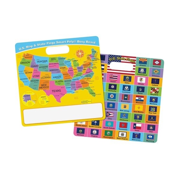 U.S. Map/State Flags Smart Poly Busy Board helps children learn to write their states, state capitals and state flags. Perfect for reusable learning anywhere, the write-on/wipe-off surface lets you write directly on the board and quickly wipes clean for your next session. Use with dry-erase or water-based markers and washable crayons. No lamination is needed. Heavy-duty cardboard coated with poly material is designed to be long-lasting, easy to clean and water-resistant for many years. Carry easily with the die-cut handle. Durable board includes a black, dry-erase marker fine point.