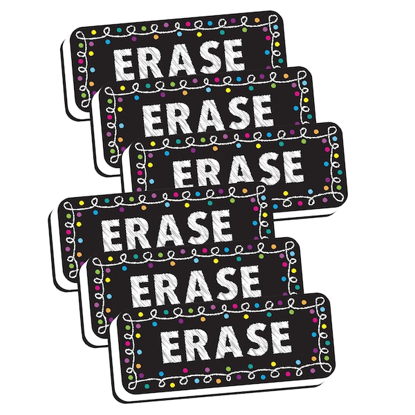 Fun and colorful design to brighten up your magnetic whiteboard. Easy to grip and hold for adults and children. Use with dry erase markers. Eraser is made from a durable foam with a black felt erasing surface. Built in magnet helps to easily stick to magnetic whiteboards and other magnetic surfaces. Measures 2in x 5in. Sold as a pack of 6 erasers.