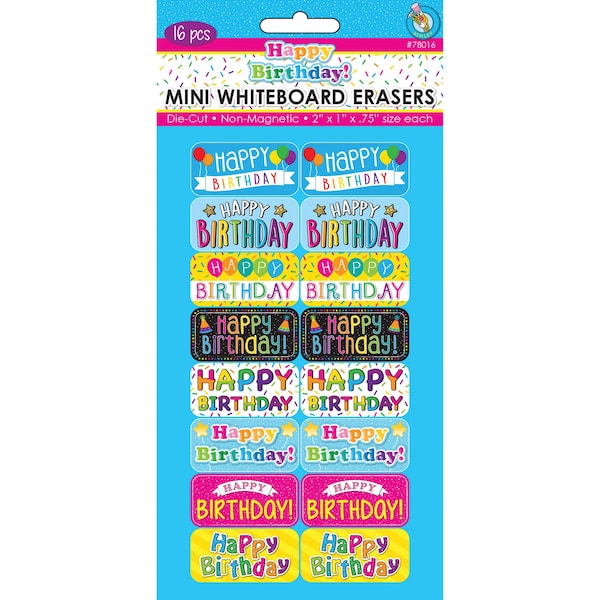 Non-Magnetic Mini Whiteboard Erasers, Happy Birthday, 16PK