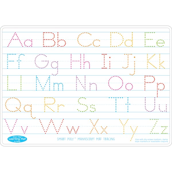 Smart Poly material has been designed for the classroom and home. The material is strong, durable, water resistant, and does not need lamination. Heavy duty double-sided surface for fun and colorful learning on both sides. Write-on/wipe-off surface. A-Z tracing on the front, numbers 1-10 on the back with 4 black handwriting lines. Use with dry erase or water based markers and washable crayons. Each side is an interactive lesson. Mat measures 12" x 17".