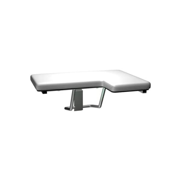 Folding shower seats shower seats are great for use in large shower stalls and shower rooms. l-shaped fold-up shower stall seat features a self-locking mechanism for secure positioning. Made of type 304 stainless steel framing. Seat frame and support legs are 1 diameter x 1-1/4 square x 18 gauge tubing with 3/16 thick mounting flanges and 16 gauge guide bracket/arm support. All exposed surfaces have #4 satin finish. Support arm fold ups when in retracted position to provide low profile against wall. Complies with ada accessibility guidelines when properly installed. Padded shower seat features a sponge cushion covered with off-white naugahyde mounted on 1/2 thick marine grade plywood. Left hand seat.