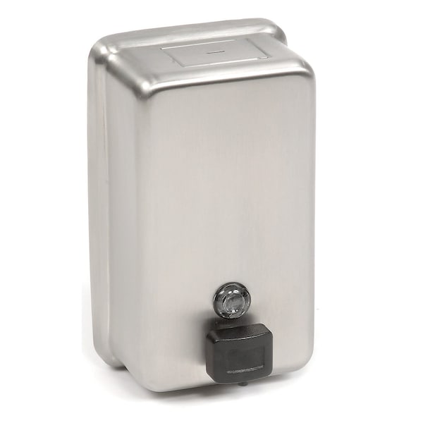 Surface Mounted Vertical Soap Dispenser shall have a capacity of 40 fluid oz. 1.18 liter of liquid or lotion soaps, synthetic detergents and antibacterial soaps containing PCMX and/or Triclosan. Dispenser shall be fabricated of 20 gauge stainless steel, alloy 18-8 type 304. All exposed surfaces shall be No 4 satin finish. Valve shall be constructed of a plastic valve body and push button with stainless steel and plastic internal parts. Valve operation shall comply with ADA Accessibility Guidelines by requiring no more than 5 lbs.22.2 Newton pressure to actuate and require no grasping or twisting by operator. A tamper resistant sight gauge shall be provided. Unit shall have a hinged stainless steel refill door on top of unit, which is opened with special key provided.