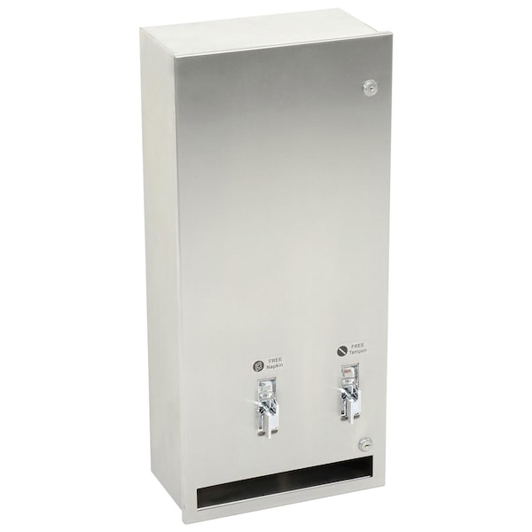 Surface Mounted Dual Sanitary Napkin & Tampon Dispenser shall hold 30 napkins and 27 tampons of specified sizes. Door shall be 18 gauge type 304 stainless steel alloy 18-8. All exposed surfaces shall be satin finish and be protected during shipment with PVC film easily removable after installation. Cabinet shall be 22 gauge same grade stainless steel. Door shall be attached with a full length 3/16 diameter 4.8 stainless steel multi-staked piano hinge and shall be held closed with two 2 tumbler locks keyed alike to other ASI washroom equipment. Internal coin-box shall be keyed differently than door locks. Dispensing mechanisms shall be fastener mounted internally to provide ability to change mechanisms for coinage denomination. Structural assembly of body and door components shall be of welded construction and have no exposed fasteners or welded seams. Weights for each feed track shall be supplied.
