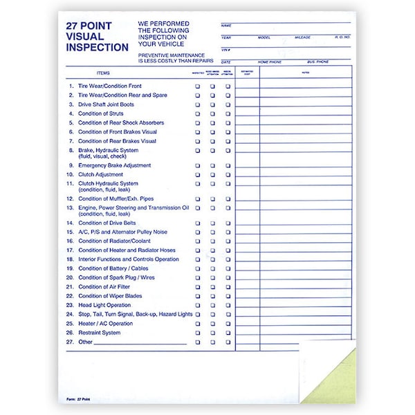 Use this 27 Point Inspection for customer satisfaction and additonal repairs. 8-1/2 x 11 2-part, carbonless, edge glued - White, Canary Prints in Black ink Packaged 100 per pack
