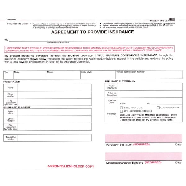 Agreement To Provide Insurance, 8 1/2" X 7" - 3 Part, 100 Per Pack Pk