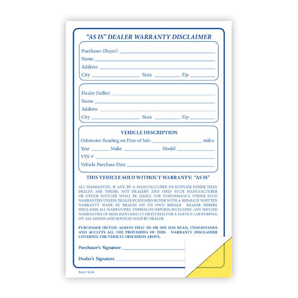 "As Is" DealerWarrantyDisclaimer, 5 1/2" X 8 1/2"- 2 Part, 100 Per Pk Pk