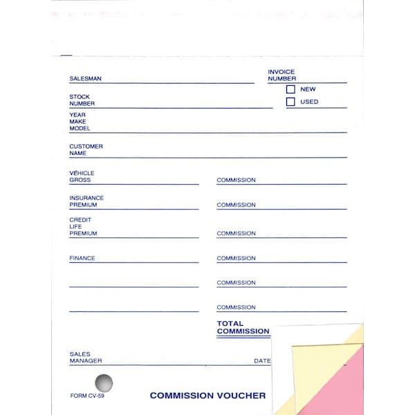 This is a very accurate way to total sales commissions on each deal. / - 4-1/4 x 5-5/8 - 3-part, snap-out, carbonless White, Canary, Pink - Prints in Blue ink - Two file holes - Packaged 100 per pack