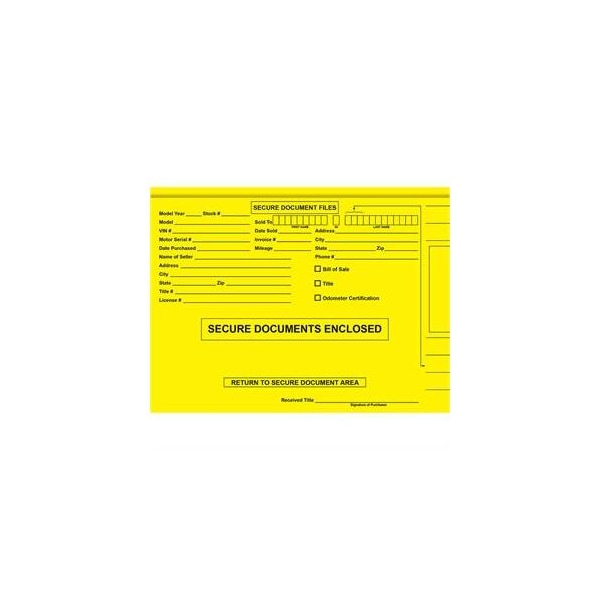 10-point Colored Jacket is pre-printed with all of the pertinent information pertaining to the vehicle sale, plus lines for placing the Color-Code Labels on the side. Easy VIN and customer name identification makes this folder easy to file and easy to locate! / - 9-1/2 x 12-5/8 overall - 9 x 12-1/2 pocket size - 10-point stock - Prints in Black ink on both sides - Opens at top - Packaged 500 per box (5 inner boxes of 100 per master carton)