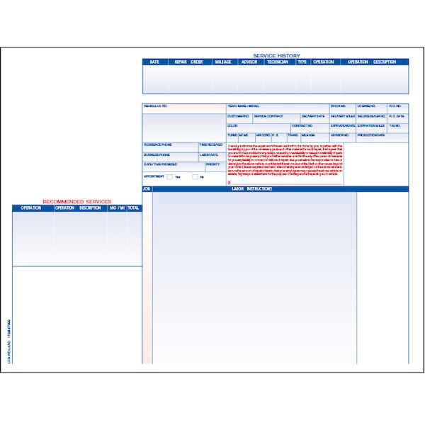 An economical alternative for laser printing service repair orders. If your current form looks like this ours should align perfectly with your software. / - 11 x 8-1/2 - 1-part, 32# White laser paper - Prints in Red and Blue ink on front and gray on back - Available in 1, 2 or 4 color imprint on quantities of 500 and up - Standard ink colors are Red, Blue, Black, Green; other colors available at additional charge - Packaged 250 per pack Compatible with ADP** and ERA* Systems.