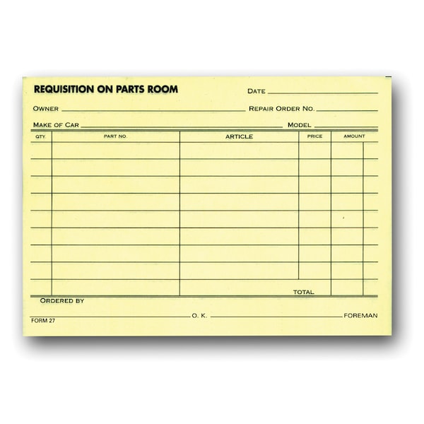 This is the least expensive parts requisition available. Each pad has 100 sheets for easy processing. / - 4-1/4 x 6 - 1-part, padded - Canary paper - Prints in Black ink - Packaged 100 sheets per pad, 1 pad per pack