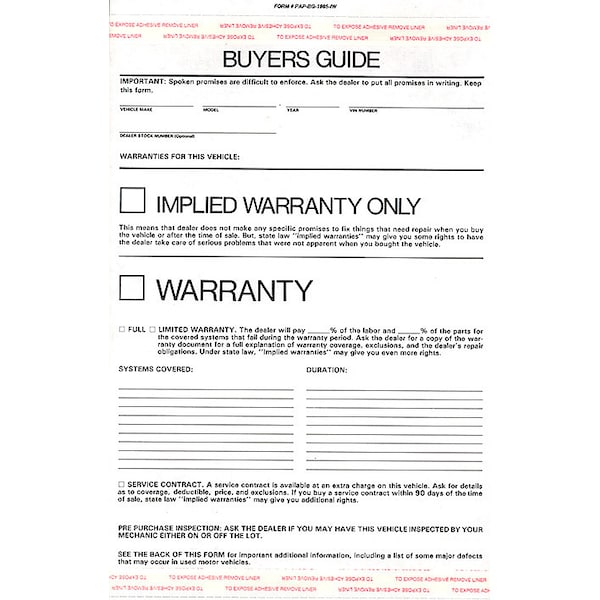 Buyers Guide with Permanent Adhesive On All 4 Sides to adhere to the inside of the vehicle window. Laser compatible. Perfed to allow easy removal of buyers guide. / - 8-1/2 x 11 - 1-part, self-adhesive - Fade resistant - Prints in Black Ink with Gray back - Packaged 100 per pack - Back Std. B.G. backer print / - Adhesive may damage aftermarket inside window tinting. Test all applications before use