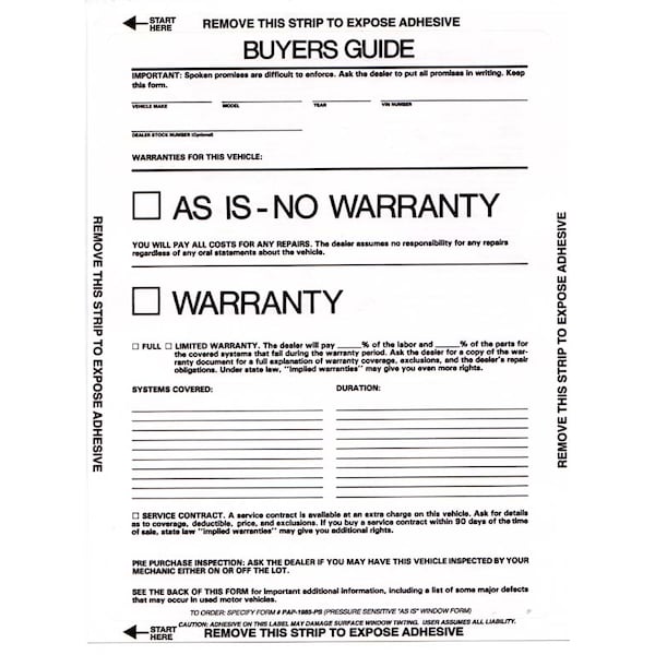 Buyers Guide with Permanent Adhesive On All 4 Sides to adhere to the inside of the vehicle window. Laser compatible. 8-1/2 x 11 1 Part Self Adhesive Fade Resistant Prints in Black Ink with Grey back Packaged 100 per pack